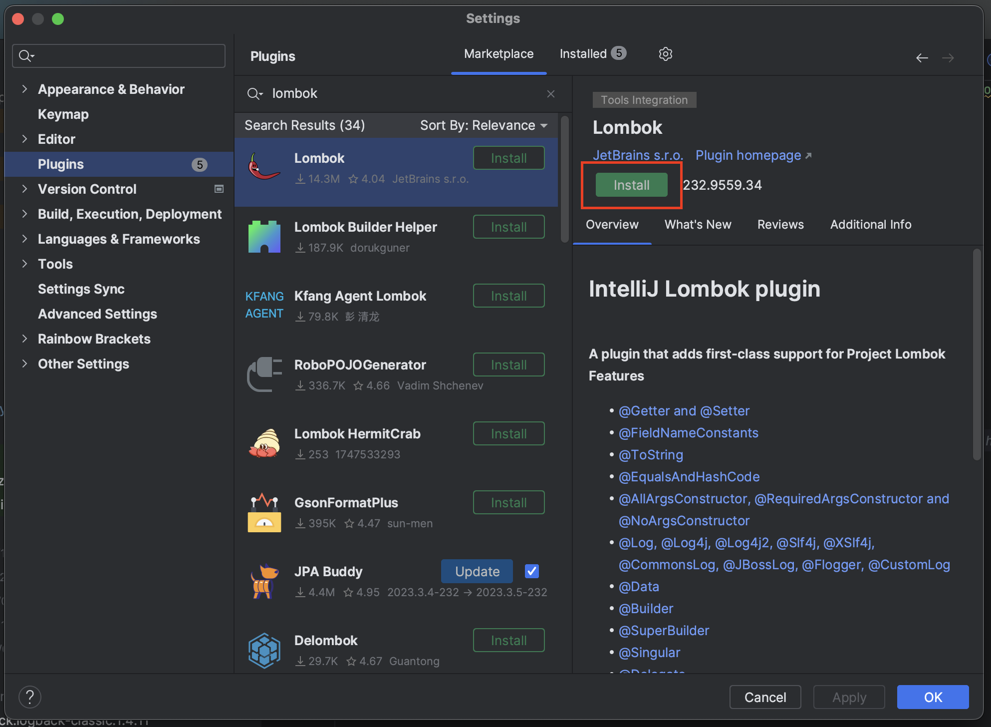 lombok plugin이 보입니다. lombok을 선택하고 install 버튼을 클릭합니다.